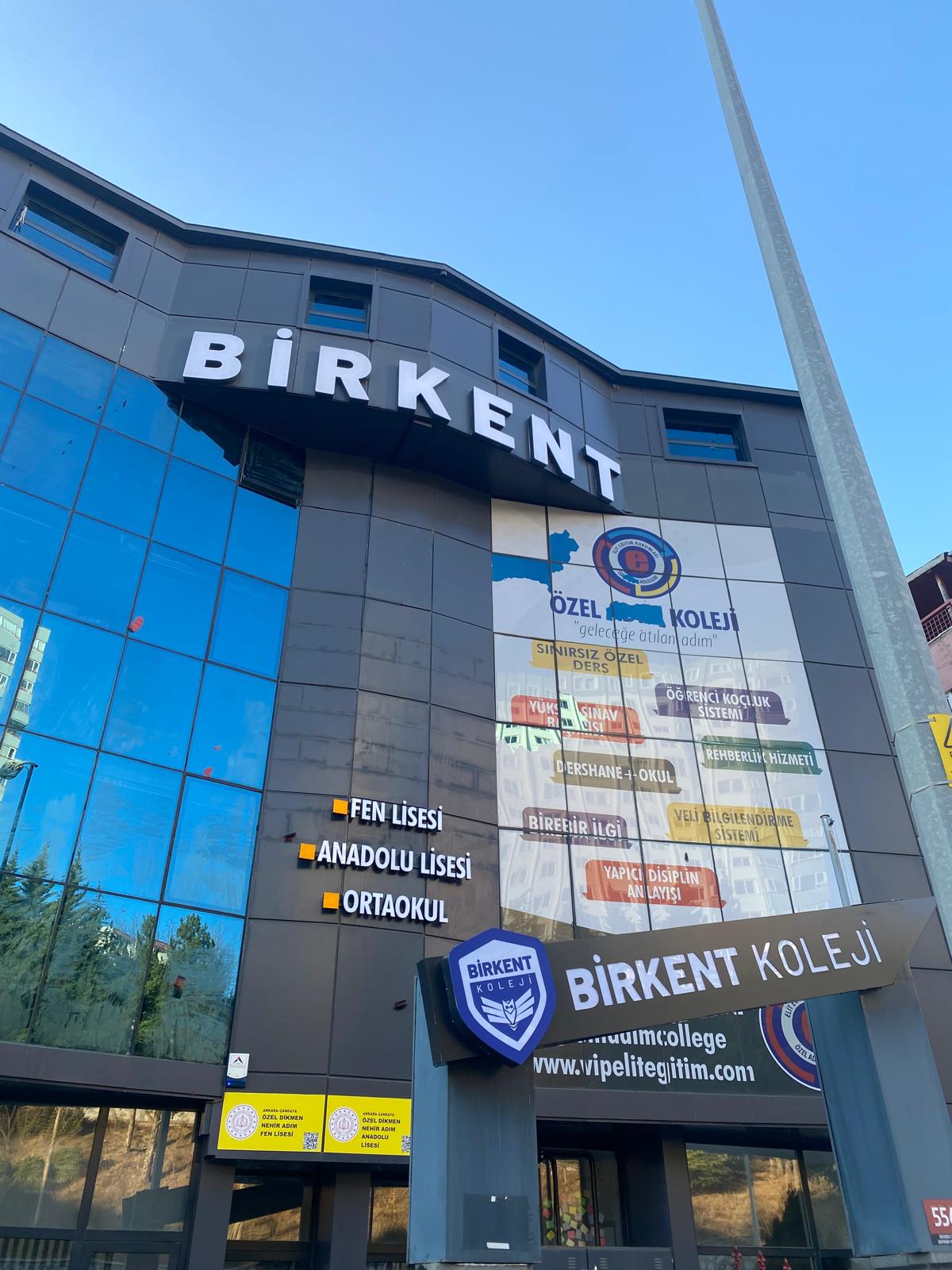 Bu projemizde, Birkent Koleji’nin prestijli kurumsal duruşunu yansıtmak adına ön cephede kavisli yüzey üzerine özel üretim ışıklı kutu harf “BİRKENT” yazısı uygulanmıştır. Modern tasarımı ve dikkat çekici aydınlatmasıyla, yapı mimarisiyle bütünleşen güçlü bir görsel etki sağlanmıştır.